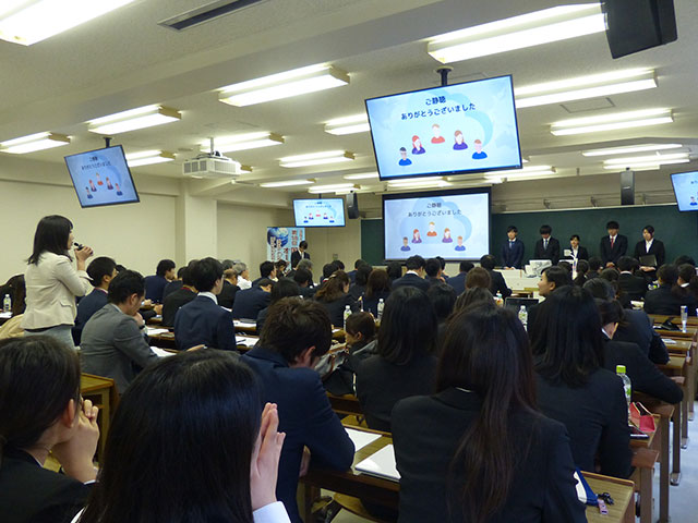 大会当日は11月13日(月)に行われた選考会には23チームが出場し、選考会を勝ち抜いた6チームがプレゼンテーションを行いました。当日は、研究の成果を見るべく国際関係学部の教員や、多くの学生達が観覧席に駆けつけました。また、30社を超える企業の方々にもゲスト審査員としてご参加いただきました。プレゼンテーションを終えた後の質疑応答の時間には、ビジネス・プロフェッショナルの視点から多くの貴重なご意見をいただくことができ、充実したゼミナール大会となりました。