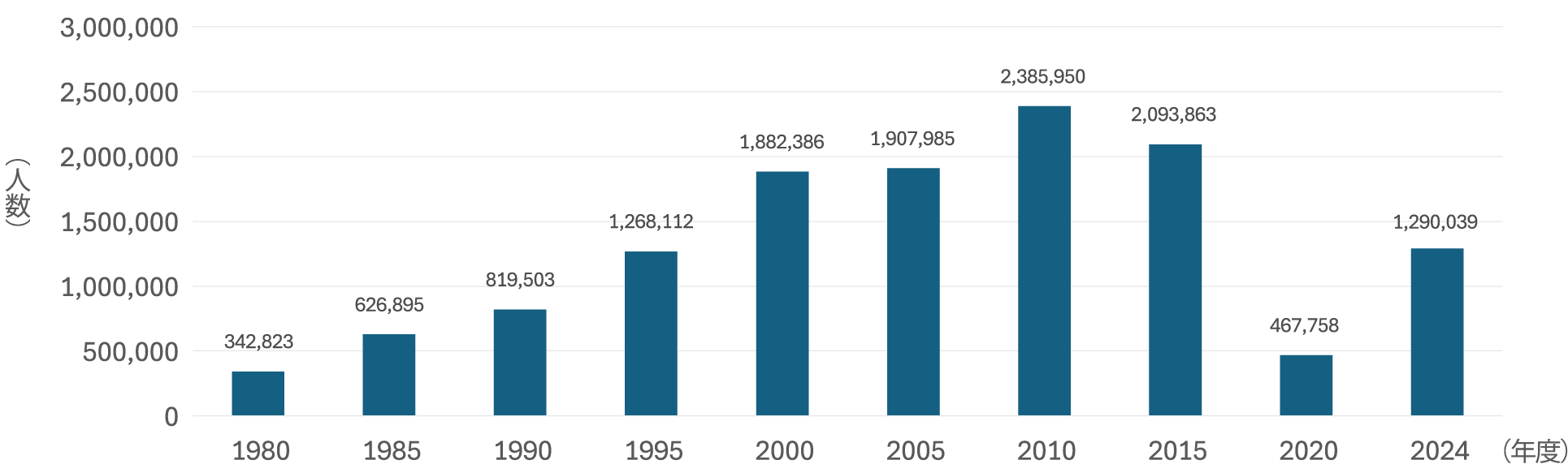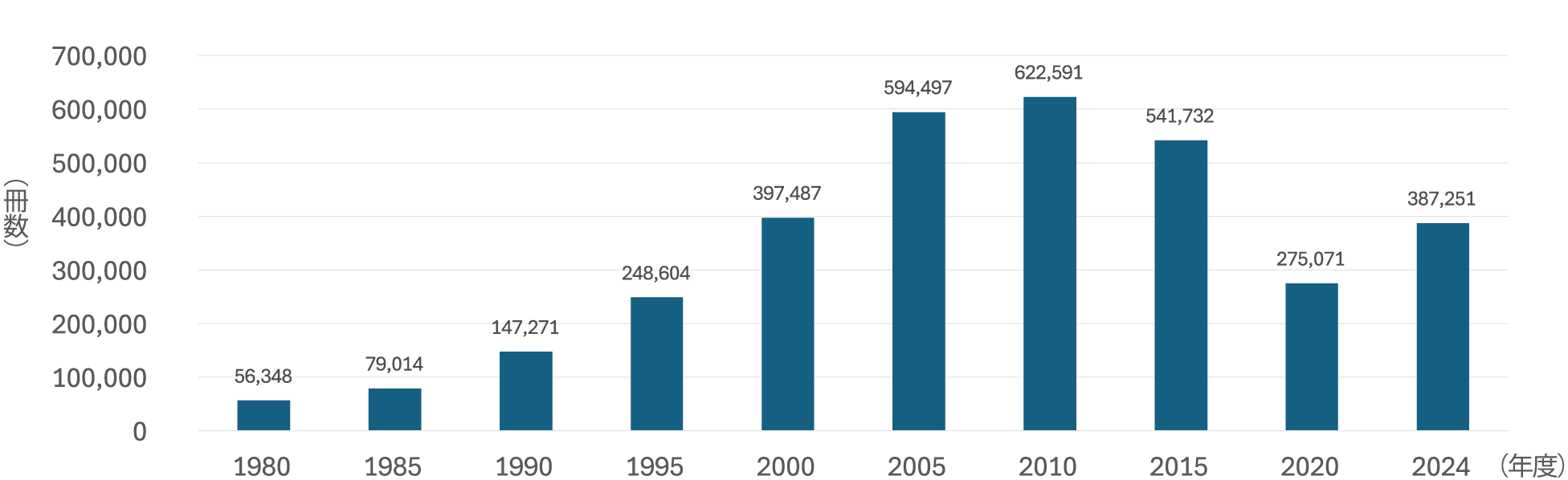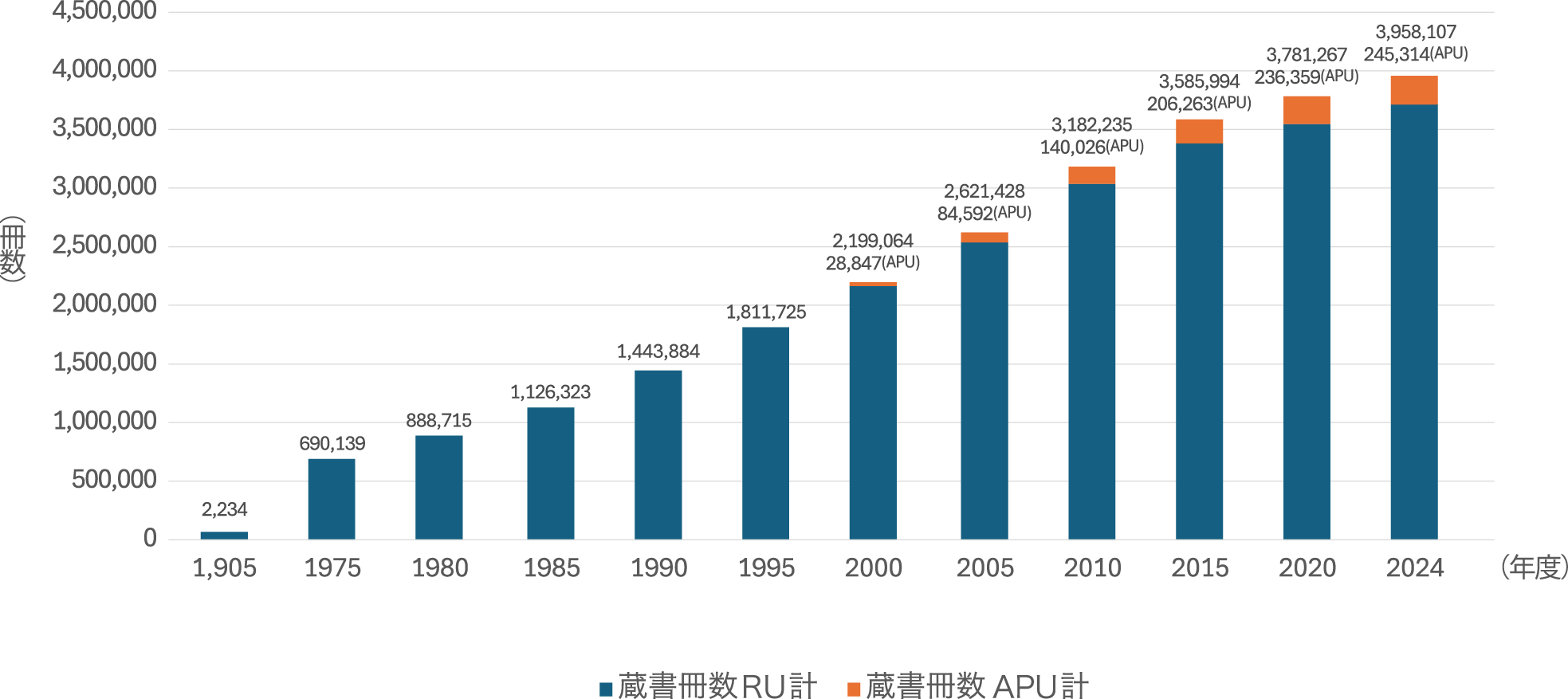 2024年度には、立命館大学で約370万冊・立命館アジア太平洋大学で約25万冊となり、両大学で395万冊を超える蔵書数となっています。