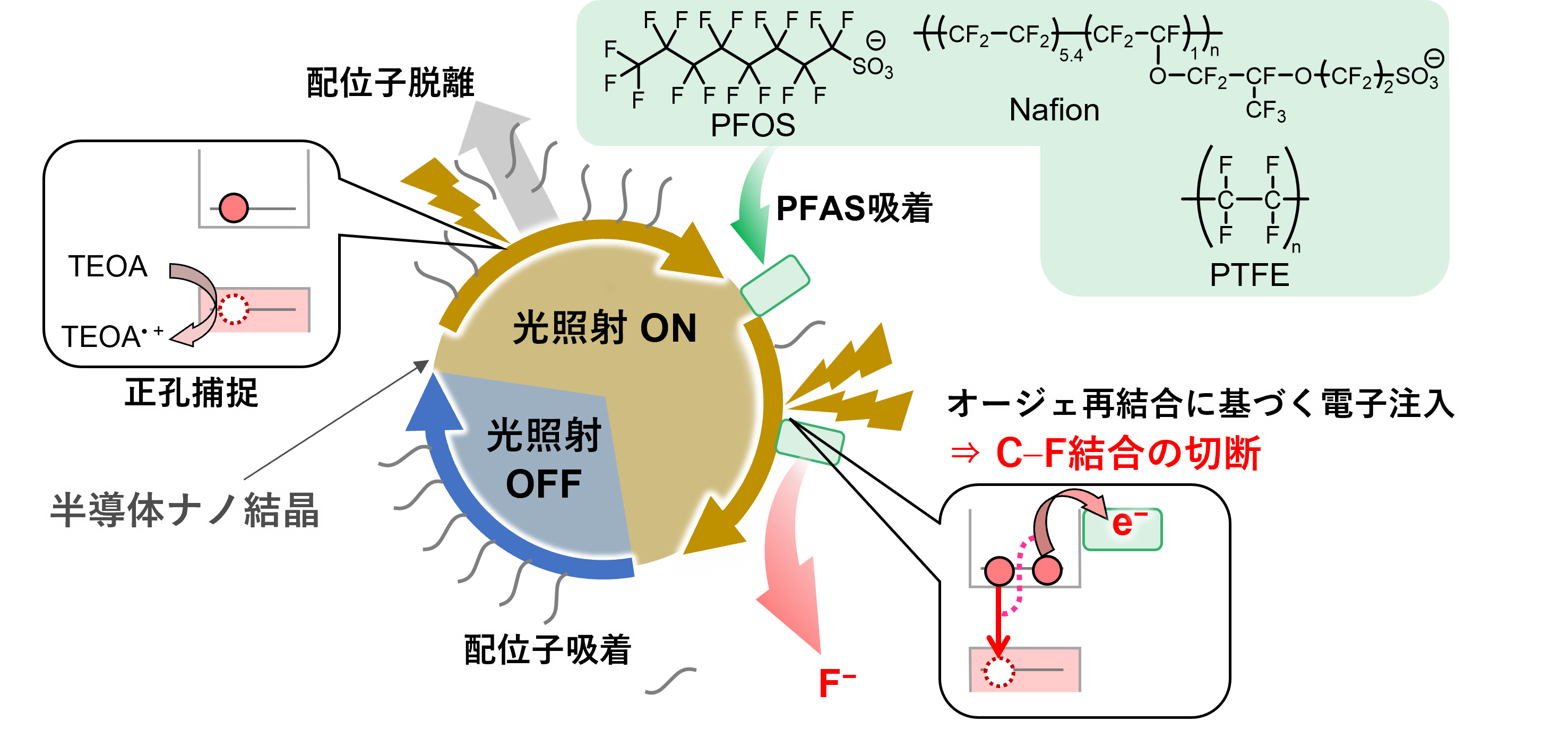 そこで私たちは、粒径に依存した特徴的な電子状態やきわめて高い吸光係数を有し、また複数の励起電子の相互作用(非線形光反応)が起こりやすい性質をもつ、コロイド半導体ナノ結晶に注目しました。例えば、1つの半導体ナノ結晶内に2つの励起電子が生成すると、オージェ再結合とよばれる、片方の電子のエネルギーをもう一つの電子が受け取り、高励起状態へと遷移する過程が高効率に発生します。私たちは、半導体ナノ結晶の光励起によって生じたこうした高エネルギーの電子をうまく取り出すことにより、可視光のような低エネルギーを用いてPFASを分解できる光触媒を開発しています。