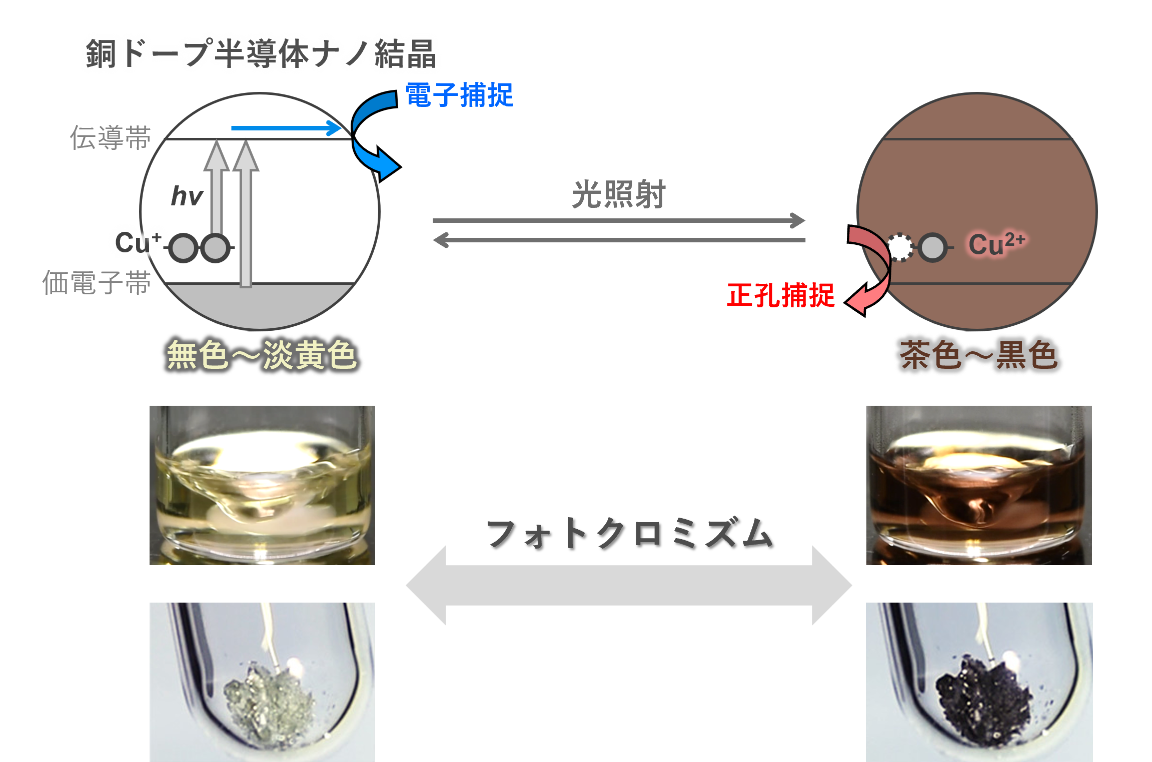 このような背景の中、我々は銅イオンをドーピングした硫化亜鉛(ZnS)をはじめとした無機半導体の数ナノメートルサイズのコロイドナノ結晶に注目し、従来の欠点を克服した無機フォトクロミック材料の開発を進めています。