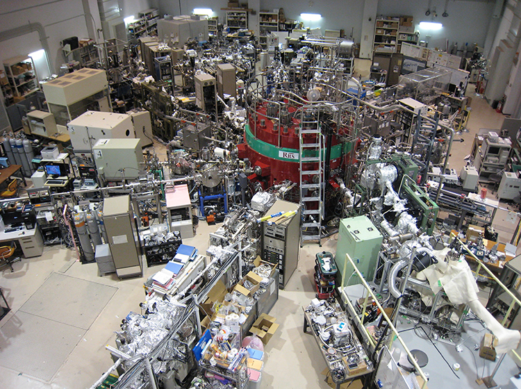 SR(Synchrotron Radiation:放射光)センターとは、赤外線からX線までの様々な波長の光を生み出す光源(写真の赤いリング)を用いて、物質を構成する原子の配列構造やその中の電子の状態を調べることができる実験施設です。例えば、充放電している途中の電池や反応中の触媒材料、ディスプレイなどに用いられる蛍光体、金属錯体や生体関連無機化合物など、様々な有用物質が機能を発現するメカニズムの解明と材料の開発に用いられます。民間企業等を含む学内外の研究者や学生が利用することができる施設で、生命科学部では学生実験にも使用しています。