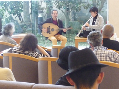 Schlöndorffの制作者であるレバノン人アーティスト、ワエル・クデさんの講演と、ヤン・ピタールさんによるアラブ伝統楽器ウードのコンサートを開催しました。両会場合計で、約130名のご参加がありました。