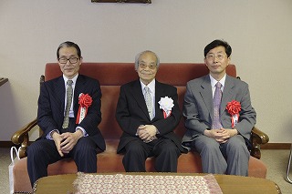 白川静名誉教授を囲んで、受賞者の石橋晴通北海道大学名誉教授(左)、沈慶昊高麗大学教授(右) |
