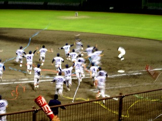 5月25日(火)、西京極球場で行われた立同戦第3戦で立命館大学硬式野球部は、9回2アウトから2塁3塁にランナーをおいて西村裕治君(産社2回生)がライト前にタイムリーヒットを放ちサヨナラ勝ちを収めた。
