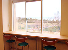 カウンター席の椅子は少し高くなっていて、クインススタジアムを一望することができます。景色を楽しみながら食事をしたい人におすすめ!時間帯によっては体育会クラブの練習を見ることができるかもしれませんね。