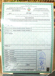 ※ハラル証明書・・ハラル(HALAL)とはイスラム教の戒律にしたがって処理された食品を意味し、ハラルに関する証明書とは、イスラム教の戒律に違反していない食品であることを表す認定書のことです。