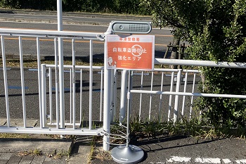 設置当日は、音声メッセージを担当した田中さんが草津警察署とともに通学者に対し、「駐輪時の自転車の施錠」の呼びかけを行いました。