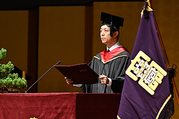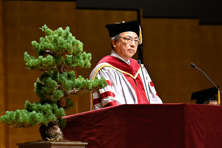 仲谷善雄学長は、「皆さんがこれから歩んでいく社会は、大きな転換期を迎えています。生成AIの登場など、技術革新が進む一方で、人と社会の在り方が問われています。不確実な時代だからこそ、失敗を恐れず挑戦し続けてください。未来を変えるのは、他の誰でもない、皆さん自身です。自由な挑戦こそが、皆さんの輝かしい人生を切り拓いてくれると信じています」と卒業生・修了生に向けてエールを送りました。