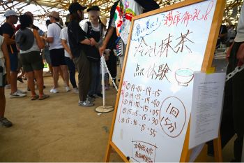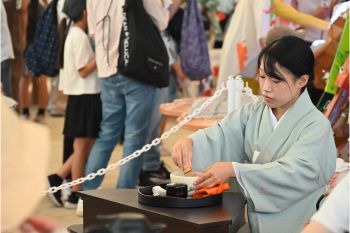 茶道研究部は8月23日(土)に同じ会場でワークショップを行っており、その際に浮き彫りになった運営上の課題を解決し、9月20日の本番ではスムーズに進行することができました。たくさんのご来場者に美味しい一服だけでなく、学生たちの心を尽くしたおもてなしと、茶道の和敬清寂や一期一会の精神をご体感いただきました。お子様や海外のお客様にもご参加いただき、茶道を通じた国際交流と文化継承の一歩として、万博にふさわしいワークショップを実施できたように思います。