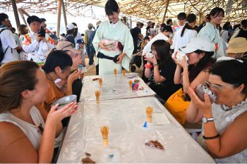 厳しい残暑を鑑み、冷たい抹茶を用意。参加者自身が茶筅でお茶を点て、そのお茶を味わってもらう茶道体験ワークショップを開催しました。お菓子はクラゲ館にちなんで、クラゲドリーム館の異名をもつ加茂水族館オリジナルの「からから煎餅」を提供。お煎餅を割ると海の生き物を象ったおもちゃが出てくるという遊び心も。