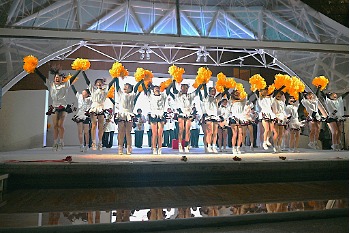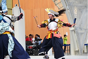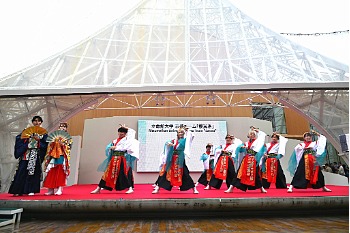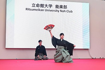 能楽部の演舞からスタートし、バトントワリング部、よさこいサークル「櫻嵐洛」、アカペラサークル「Song-genics」、和太鼓ドン、JAZZ研究会、応援団吹奏楽部・チアリーダー部が出演。バトントワリング部と応援団チアリーダー部はそれぞれ立命館守山高等学校、立命館宇治高等学校とのコラボパフォーマンスも行いました。厳かな能に始まり、華やかかつ統率のとれた演舞、迫力ある歌唱に演奏…と見ごたえたっぷりのステージを終日披露しました。