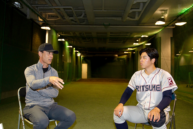 関西学生野球秋季リーグで12季ぶり(コロナ禍中止を除く)の優勝に貢献したエースの有馬伽久(がく)投手(産業社会学部3回生)と、OBでプロ野球のオリックス・ブルーウェーブと米メジャーリーグ(アナハイム・エンジェルス、シアトル・マリナーズ)でも活躍した長谷川滋利さんが、感動の渦に包まれた優勝直後、今と未来に向けて熱く語り合いました。勝ち点を挙げれば優勝が決まる伝統の「立同戦」初戦に先発し、勝利を収めた有馬投手が、2回戦では同点の9回から熱血登板。延長10回、サヨナラ勝ちを呼び込む投球と打撃を披露し、見事に6年半ぶりの栄冠を勝ち取りました。来秋のドラフト候補左腕が、プロ入りと将来のプランを長谷川さんに打ち明けると、「わかさスタジアム京都」で当日、現地観戦した大先輩からは自らの体験談や長期の目標設定に加えて、メンタルトレーニングの重要性などを優しくアドバイス。さらなる飛躍を目指す有馬投手には、米メジャーリーグ挑戦の偉大なパイオニアのひとりとなった長谷川さんとの絆が深まる貴重な時間となりました。
