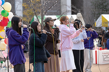 澄み切った冬晴れの中、中央ステージは書道部によるパワフルなオープニングパフォーマンスにより開幕。その後はよさこいサークル「京都チーム 櫻嵐洛」、ストリートダンスサークル「R.D.C.」、カラーガードサークル「LUSTER」などさまざまな分野の団体が堂々としたステージを披露し、会場は熱気に包まれました。