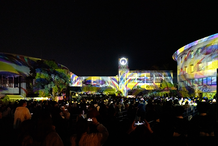 最後は、立命館大学学友会と連携した立命館創始155年・学園創立125周年記念事業として「2025 りつめい学祭「125%」×デジタル掛軸」を実施。篠笛の音色をバックに、中央広場周辺の建物に壮麗な特別映像が投影され、光と音の演出が学園祭のフィナーレを彩りました。