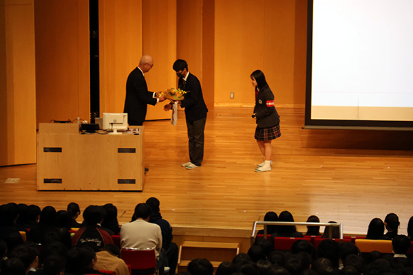 また、ご自身の中高時代を振り返りながら、本校での学びや経験が現在の仕事にも生かされていることを語られ、在校生に向けて温かく、そして力強いエールを送ってくださいました。講演終了後には、生徒代表によるお礼の挨拶とともに、感謝の気持ちを込めて花束を贈呈しました。
