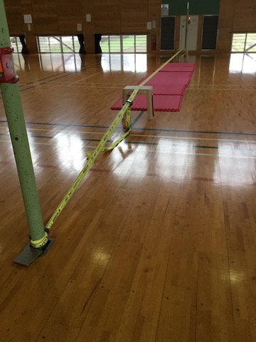 スラックライン(Slackline)とは、5センチ幅程度のポリエステル製のベルトを2本の支柱間に張って、その上を歩行したり、ジャンプしたりするものです。数年前より我が国でも公園等でやっているのを見かけることも増えてきました。通常屋外の太めの木と木の間に設置されることが多いのですが、今回は体育館のなかでも実施できるように、バレーボールの支柱を利用して設置しました。設置においては、なるべく支柱の根元付近にラインを結ぶようにし、支柱が曲がらないように配慮した上で、その分ラインの高さを出すために、途中で60センチ程度の踏み台を2台設置しました。トレーニングに導入したいと思われるかたはぜひ参考にされてください。