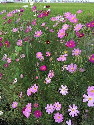 水田では、稲穂が黄金色に実り「首を垂れている」稲の刈り取り作業をしている一方で、まだ穂が青い稲もあります。そんな水田の一角に「コスモス(秋桜)」が咲いていました。色とりどりの花が、自己主張するかのように咲いている様子を見ると、少し嬉しくなってきます。近所の青果店では栗を見つけました。早速、栗ご飯にして頂きました。