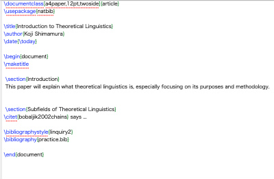 先週は最後に「次回はもう少し論文ぽくしていく」と書いたと思います。なので、今日はセクションの作り方と参考文献の書き方を示したいと思います。とりあえず、先週のファイルを開いてください。論文ぽいということなんで、僕は言語学の論文を書く体で書いていきますね。まあなんでタイトルは変えます。セクションを作るコマンドは \section{…} です。そうすると勝手に数字が入ったセクションが作られます。{…} にセクションタイトルを書いてください。ちなみにサブセクションは \subsection{…} です。サブサブセクションは \subsubsection{…} です。わかりやすいですね。以下のコードをタイプセットします。そうすると文章ファイルが出てきますね。