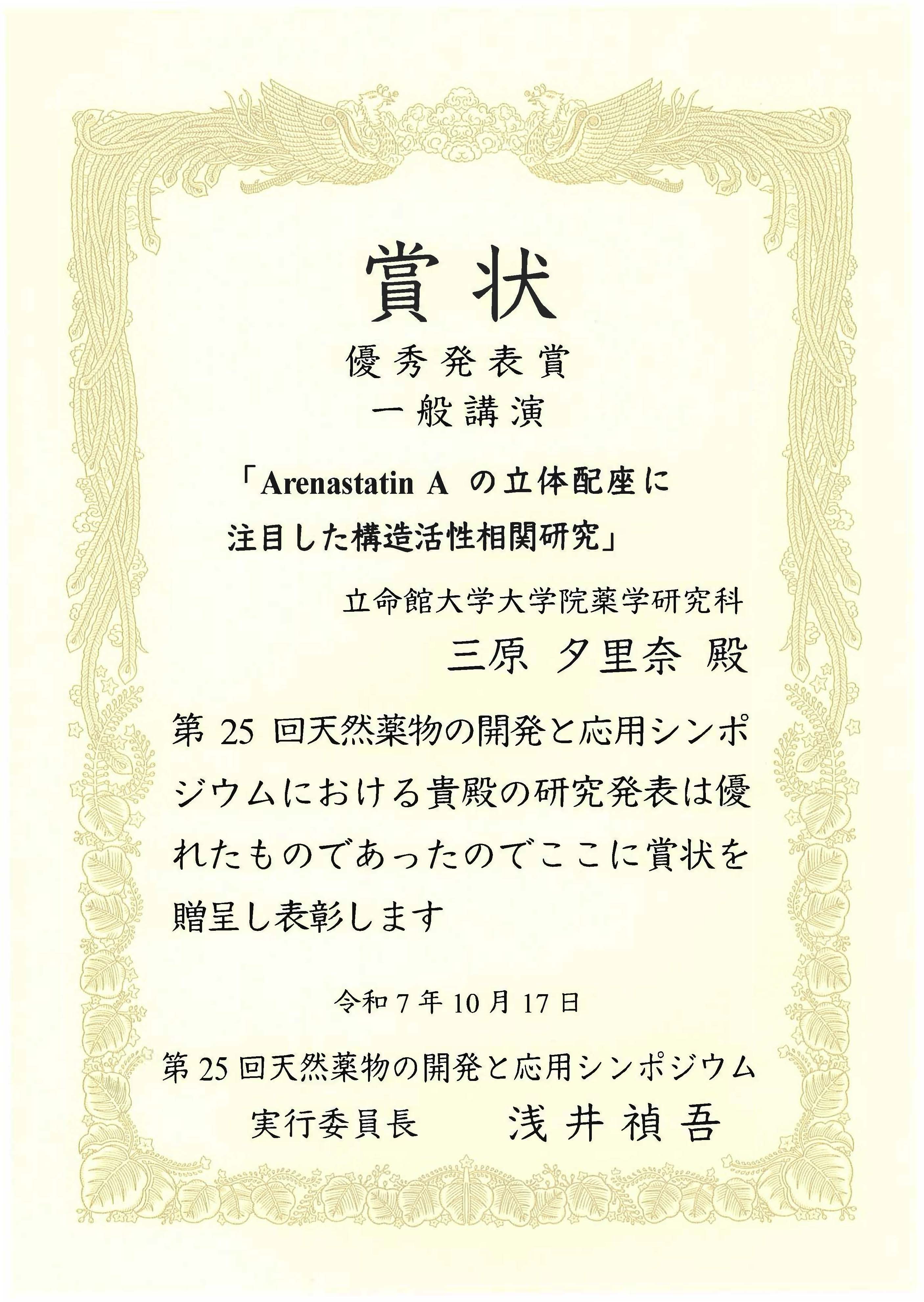 2025年10月11〜12日に開催された第25回天然薬物の開発と応用シンポジウム(仙台市)において、以下の通り受賞しました。