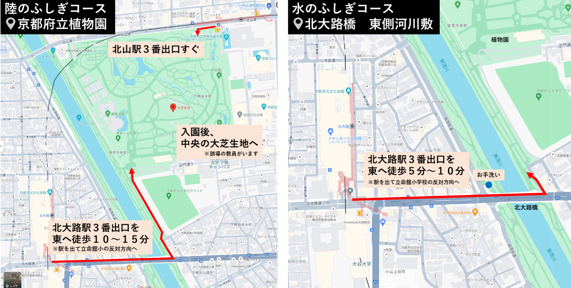 申込受付が完了された方は以下の点をご確認いただきご参加ください。 ①集合場所について 「陸のふしぎ」コース→京都府立植物園 大芝生地 「水のふしぎ」コース→賀茂川・北大路橋 北東河川敷 集合場所等の詳細については事前にメール・LINEでご案内しますのでご確認をお願いします。 ②お持物・服装について 1)「陸のふしぎ」コース ・植物園入園料(保護者200円、幼児無料) ・動きやすい服装 ・帽子、タオル、ビニール袋 ・水筒(ペットボトル可、お名前を記入して下さい) ・受付票(スマホメールまたは印刷した紙など) 2)「水のふしぎ」コース ・濡れてもよい服装(子どもの膝辺りまで入水予定) ・ウォーターシューズ(長靴不可) ・帽子、タオル、ビニール袋(濡れたものを入れます) ・水筒(ペットボトル可、お名前を記入して下さい) ・受付票(スマホメールまたは印刷した紙など) ③保護者のお持物・服装について 保護者の方もお子様といっしょに活動していただきますので、お子様と同様の動きやすい服装(水のふしぎコースは濡れてもよいもの)とお持物をご準備ください。 「水のふしぎ」コースお子様だけで川に入る活動はできませんので必ず親子で入るように靴や服などをご準備ください。必要に応じて、着替えも(お子様の分を含む)ご準備ください。 また「水のふしぎ」コースは荷物を置いて活動できますが、貴重品はお預かりできませんので、必要に応じて貴重品を身に着けておくためのポーチ等をご用意ください。 ④天候等による開催場所の変更は、学校HP、miraicompass、LINEで前日14時までにご案内します。雨天時は立命館小学校内で活動を予定しています。