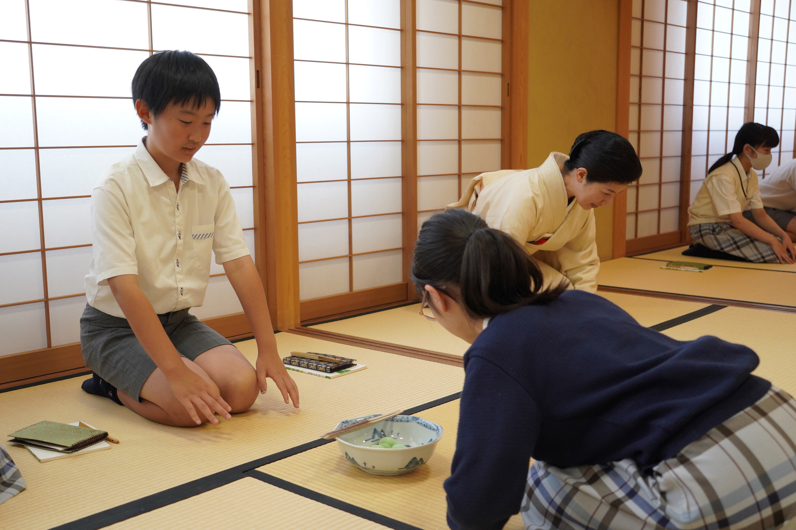 「立命科」では、道徳に加え建学の精神や体験活動を重視しており、その一つとして5・6年生は茶道に取り組みます。茶道を通して礼法や思いやりの心を育みます。保護者を招くお茶会では、図画工作科でつくった茶碗や草木染の古帛紗を用い、クラスのテーマに合わせた和菓子や、大徳寺の高田管長様による揮毫の軸を選びます。道具や場のしつらえも自分たちで考え、感謝を込めておもてなしを行います。