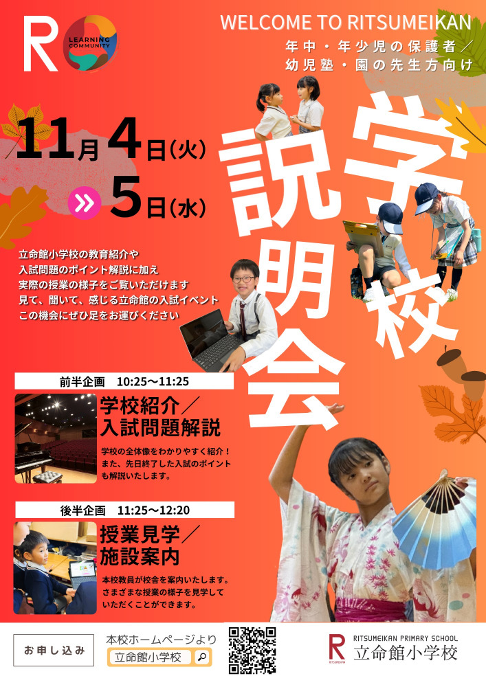 2027年度以降に立命館小学校の受験を検討されている保護者の方、塾や幼稚園・保育園等の関係者を対象とした説明会です。小学校の施設や授業風景を見学いただきながら、入試の概要や教育の特色を知っていただける絶好の機会です。ぜひご参加ください。