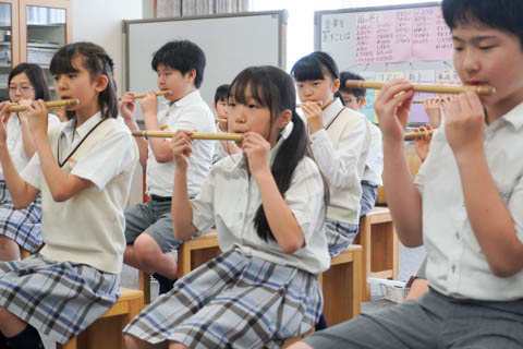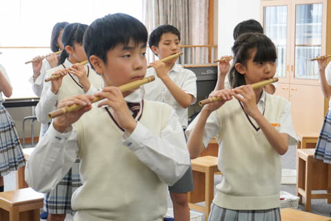 伝統文化をまなぶ2019.05.17 6年生 音楽「篠笛の授業が始まりました」 6年生 音楽「篠笛の授業が始まりました」6年生の音楽の授業では、篠笛の学習が始まりました。1回目の授業では、息の出し方、基本の姿勢、作法などを学びました。優雅に見える篠笛演奏ですが、見るのと実際に演奏するのとでは大違いです。児童たちは先生に教えていただきながら、息の出し方や口の形などを何度も練習しました。そして、ようやく初めてきれいに音が出ると「やった!」と大喜びでした。次回は曲の演奏に挑戦します。
