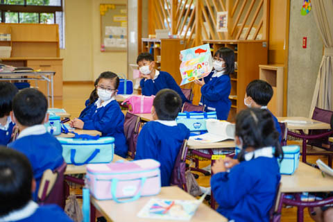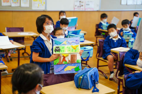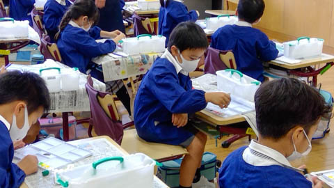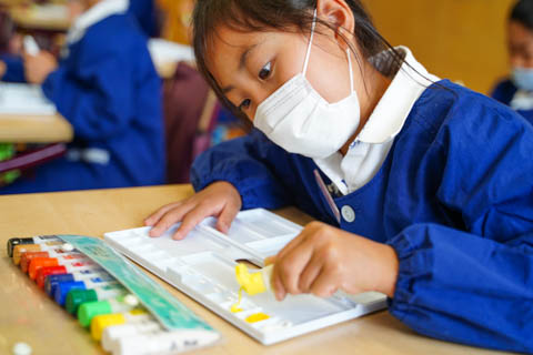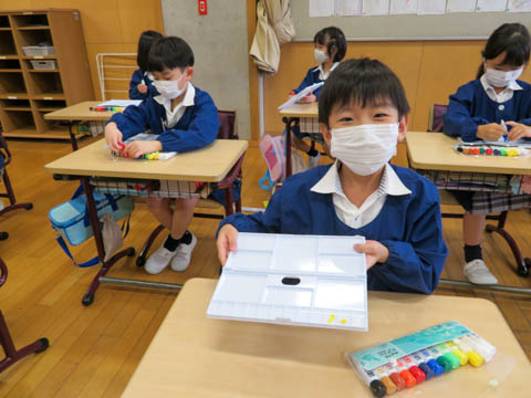 表現をまなぶ2020.06.24 2年生 はじめての絵の具 図工 絵の具6月24日(火)、2年生になって初めての図工の授業。はじめにオンライン学習中の作品発表をしました。お互いの作品に興味津々で、楽しく鑑賞し合いました。そのあとは、初めての絵の具の学習です。慎重に、絵の具の量を考えてパレットに出すことができました。素敵な色の世界が広がります。