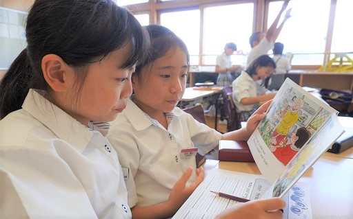 We offer rich reading input through storytime, shared reading, and independent reading. Our school library has over 4000 books in English. Listening skills increase in part due to our team teaching styles and our efforts to conduct English lessons in English. Students also listen to their classmates in various activities, and from early on we encourage memo taking skills. We teach some basic writing, and for spoken output we provide an array of tasks including self-introductions and presentation projects.