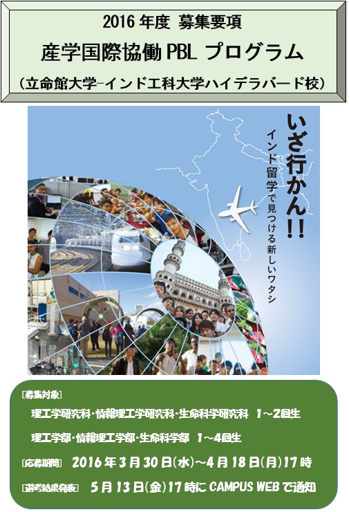 学部・大学院生対象 『2016年度 RU-IITH 産学国際協働PBLプログラム』の募集を開始しました(4月18日(月)17時まで)