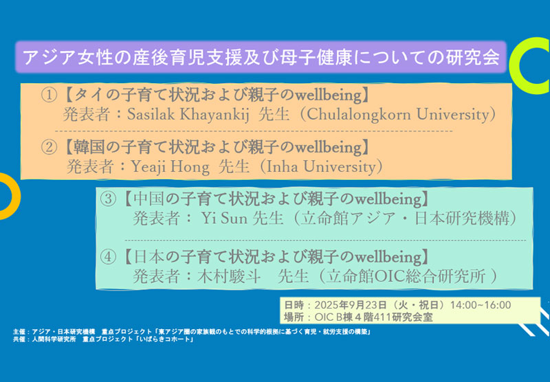 【9/23(火)】AJI研究所重点プログラムとして研究会開催!「アジア女性の産後育児支援及び母子健康についての研究会」(プロジェクトリーダー:矢藤優子教授)