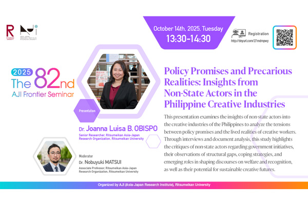 【10/14(火)】第82回AJI研究最前線セミナー開催!Dr. Joanna Luisa B. OBISPO, “Policy Promises and Precarious Realities: Insights from Non-State Actors in the Philippine Creative Industries”