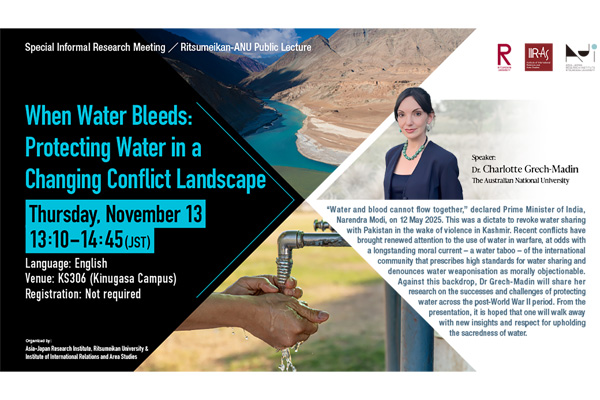 【11/13(木)】立命館/ANUパブリック・レクチャー開催!Dr. Charlotte Grech-Madin, When Water Bleeds: Protecting Water in a Changing Conflict Landscape