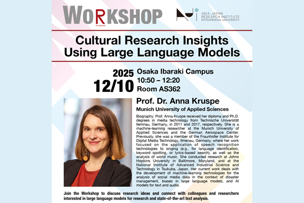 【12/10(水)】国際ワークショップ “Cultural Research Insights Using LLM” (Prof. Anna Kruspe)開催!(アジア・日本研究推進プログラム)