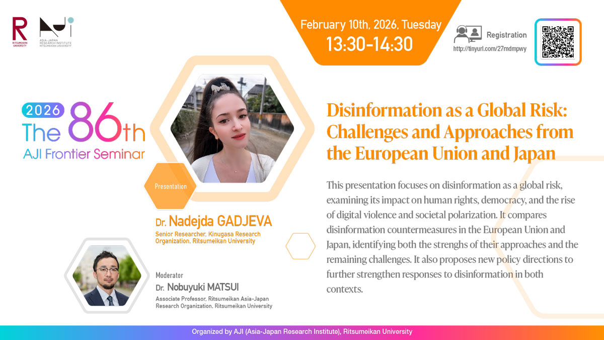 【2/10(火)】第86回AJI研究最前線セミナー開催!Dr. Nadejda GADJEVA, “Disinformation as a Global Risk: Challenges and Approaches from the European Union and Japan