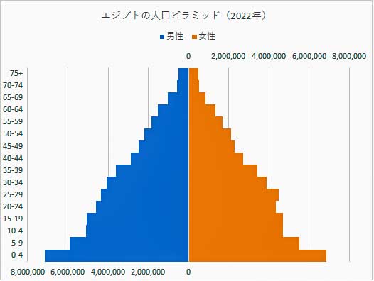 エジプトの中央動員統計局(略称CAPMAS)によれば、2023年1月9日時点の人口は、1億人(104,428,009人)を超えている。エジプトでは、5年ごとにセンサスをとっているが、2017年には1億に少し足りない、94,798,827人であった。人口ピラミッドの形からもわかるように(図2)、エジプトの人口はいまも増え続けているのだ。
