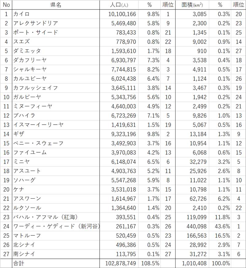 国内人口の分布を見ると(表1、2022年1月1日推計)、ナイル川をはさんで東西に広がる首都カイロとギザの2県で全国の約2割、2千万近い人口が集中している。首都圏には環状道路が張り巡らされているが、その外側に膨れ上がるように住宅地が拡大している。第2の都市といわれるアレクサンドリアの人口がカイロの半分ほどの約550万人であり、県別人口数の順位としては第9位にあたる。カイロとアレクサンドリアの間には、デルタの諸県(第3位シャルキーヤ、第4位ダカフリーヤ、第5位ブハイラ、第7位カルユビーヤ)と上エジプトの諸県(第6位ミニヤ、第8位ソハーグ)がある。これらはかつて農村地域であったが、急速に都市化し、多くの人口を擁するようになっている。
