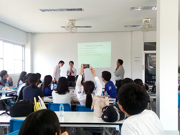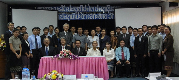 そのこともあり、90年代の私は、主として留学生の受け入れとラオス国立大学法学部への教育支援というソフトの側面での協力に注意を向けるようになり、JICAの法整備支援とも協力し、いくつかのセミナーも企画しました。一つは、ラオ語とタイ語の近似性に着目し、タイ・タマサート大学とチュラロンコン大学の友人の協力を得て日本、ラオス、タイの法制度比較というセミナー(名古屋大学の松浦教授と慶応大学の松尾教授の応援もありました)を開いたのはすでに10年前になります(写真1)。立命館法学部在職期間はアセアンスタディーという2単位授業を考案し、アセアン3国を10日ほどで駆け巡るのですが、その3か国の一つには必ずラオスを入れるようにしました。学生に、タイ、インドネシア、マレーシアのような開発が進んだ国ばかりではなく、アセアンには、まだまだ途上国(しかも最貧国)があるのだということを見てもらいたかったことと、それを機に、私も同行し、ラオス国立大学法学部の教員と協力して、2コマだけですが両大学の学生が一緒の授業を受けられるようにすること(写真2)、そしてそのあとに、私の最も気に入っているビエンチャンの中心街にあり、2階が屋外ビアガーデンとなっているコプチャイドウーというレストランにおいて、ラオスビール(ビアラオ)で一日を総括し、翌日の出発直前には、メコン川岸のホテルの屋上から沈む夕日見ながら、最後にもう一度ラオ料理を堪能し、ツアーを締めくくる(写真3 - たまたま女子学生だけが写っていますが、半数以上は男子)ことが目的でした。