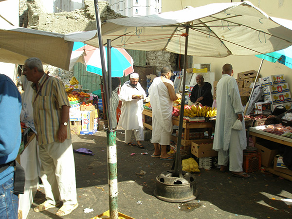 聖モスクの周辺は先ほど述べたように、高層ホテルが建ち並び、そのホテルの中には地上数階までヨーロッパのショッピングモールさながらに高級品といった感じのものが並べられている。やはり、改築前の頃に思いを馳せると、そこには門前町風情が漂っており、小さな土産物売りの店が軒を連ねていた。その一軒、一軒、時間をかけて見て回る楽しみがあった。本屋もほとんどが宗教書ばかりであったが、礼拝後に本屋に立ち寄り、本屋の主人との他愛もない会話も楽しみであった。聖モスクへ通じる東側の主要道路の両脇には土産物売りの店が並んでいたが、店と店の間を奥に入っていくと、そこには昔ながらの市場があり、礼拝に来た人たちが一日の食材を求めて集まってきていた。雑貨店のオヤジは、品物を求めると、座ったままで、愛想も無く、自分で取りな、と言って取り棒を渡すだけであった。そんな頑固そうなオヤジの姿も懐かしく思う。このような古びた風景はもう昔の話となり、今では小綺麗な店舗が並んでいる。