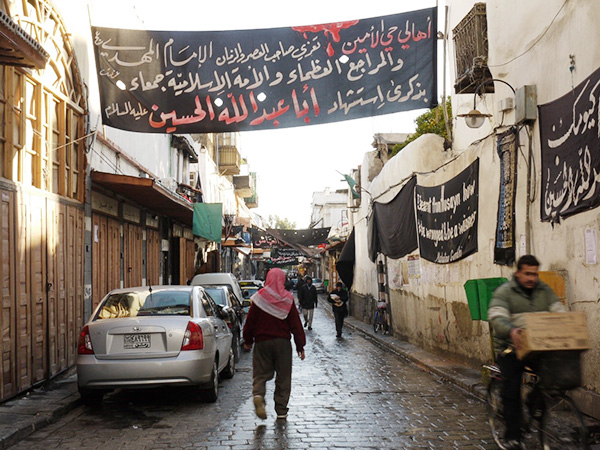 シリアの首都、ダマスカスの中心に位置する旧市街の一角に、奇妙な雰囲気を醸し出す地区がある。旧市街の西側に位置するスーク・ミドハト・パシャを貫く「真っすぐな道(al-Shāri' al-Mustaqīm)」を東に歩いていくと、旧市街の中ほど、南へと向かうアミーン通りと交差する地点で、他の地区とは明らかに異なる景観が姿を見せる。普段は通り沿いに土産物屋や小売店、レストランが立ち並び、観光客で大いに賑わう場所であるが、一年のうちのある特定の時期になると、通りが黒い旗や横断幕、劇画調の人物画に埋め尽くされ、人びとの服も黒いものが多くなる。さらに、モスクや公共の場でさまざまな宗教行事が行われているが、旧市街の他のイスラーム地区では、同様の行事が行われる様子は全くない。