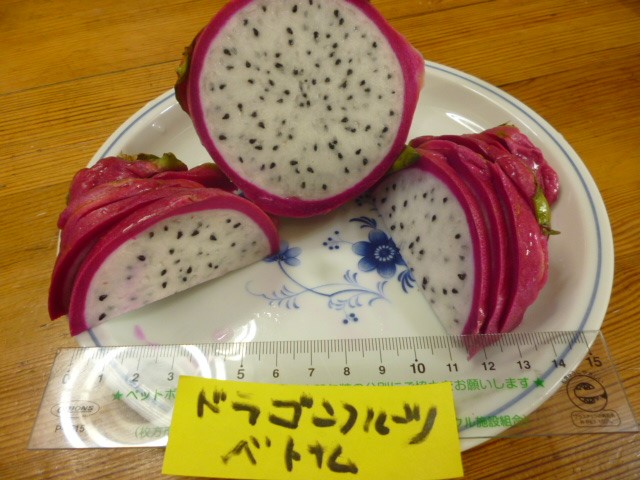 ベトナムでは、さまざまな果物を楽しめる。20年ほど前に初めてホーチミン市で食べて以来、私のお気に入りは、ドラゴンフルーツ(ピタヤ)である。拳くらいの卵形をしており、鱗のような赤い果皮、乳白色の果肉、胡麻のような種子、断面は美しく、あっさりした甘味をしている(写真1)。2009年頃から、ベトナムから日本にも輸入されているが、追熟しないので、国内で食べると甘味が少なく感じる。私は長い間、このドラゴンフルーツを、マンゴーやキウイのように木になる果物と思い込んでいた。数年前、小学生の息子の夏休みの自由研究の手伝いで、カットフルーツ盛り合わせをスーパーで購入し、各フルーツの輸入先を調べ、その種を蒔いて成長を観察した。アメリカ産のオレンジ、南アフリカ産のグレープフルーツ、ニュージーランド産のキウイから芽が出た。ドラゴンフルーツは、やはりベトナムから輸入されたもので、種を土に蒔いてみると、これもすぐに双葉が出た。数日後、双葉の間から産毛のような棘の生えた本葉が顔を出したとき、これがサボテンであることに気づいた。成長した姿をネットで検索したところ、ビントゥアン省の畑の紐サボテンは、緑色のヤマタノオロチが首を垂らしながら赤い卵を産んでいるようだった。ドラゴンフルーツの元の姿は知ることができたが、栽培方法や収穫時期、どんな肥料や農薬が使われているか、まだまだ知らないことが多い。
