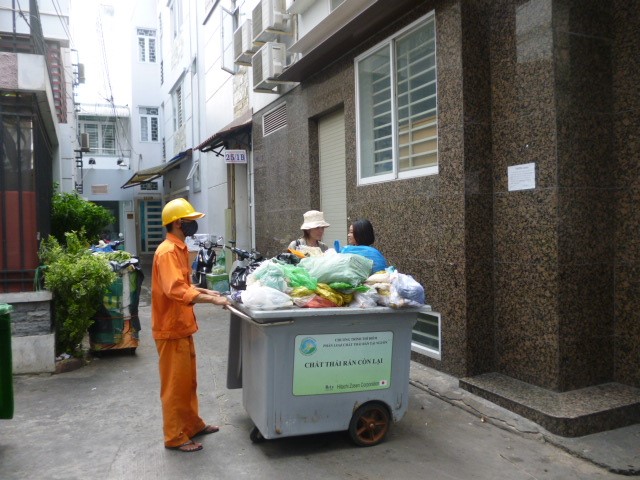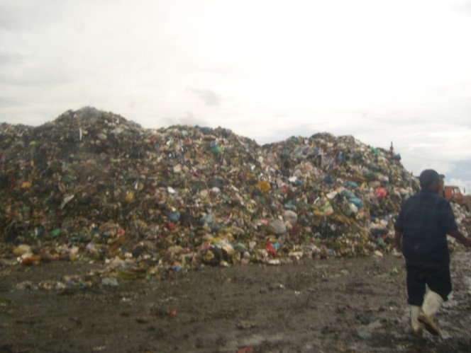 ベトナムの活気のある大衆食堂での食事は楽しいが、エビの殻やドラゴンフルーツの皮など、当然ながらゴミが出る。ナプキンやライムの皮などは、床にそのまま捨てられ、その乱雑さが店が繁盛していることを表している。これらのゴミは、プラスチックゴミと一緒にビニール袋に入れられ、店前の道路脇に置かれる。家庭ゴミも同様である。それを環境公社が町を巡回してゴミを集積場所に運ぶ(写真2)。ベトナム旅行をされた方は、ホテル周辺の通りでその光景を見たことがあるかもしれない。さらに集積場所からゴミを収集車が埋立処分場に運ぶ。金属などの有価物は回収してリサイクルもされているが、ゴミの7~8割は、そのまま埋め立てられている。埋立処分場の場所は、最近では計画的に決められてるが、古くからあるものは、町中の空き地に何となくゴミが集まり、自然とそうなったところもある。ホーチミン市のGo Cat処分場、Phuoc Hiep処分場、ビンズオン省のNam Binh Duong処分場などに訪問したが、そこには、一般の人が立ち入ることはなく、日常とは切り離された別世界のようである。静かで巨大なごみの山の中には、生ゴミやペットボトル、衣類、サンダル、タイヤ、日本のメーカーのインスタント食品の袋や、アニメキャラクターが印刷された玩具もある(写真3)。埋立が終わった処分場の区画には、土が被せられ、雑草が伸び、バッタやトンボが飛び交っている。プラスチックや金属などの安定した物質は、ここに半永久的に埋められる。日本の場合、可燃物は焼却されて灰になってから埋められるが、ベトナムでは、生ゴミの中の有機物は、微生物に分解されて、悪臭の原因となる有機酸となって水に溶け、さらに二酸化炭素やメタンになって大気に戻る。物質社会における「世界の果て」は、ここなのかもしれない。