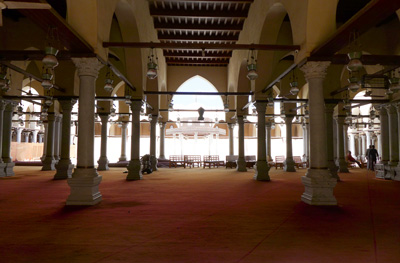 時代から捉えると7世紀にアムル・イブン・アル・アースがエジプトを遠征し、各地にモスクを建設したことからエジプトのイスラーム建築は始まる(写真1)。しかしながら、フスタート(現在のカイロ)のアムル・モスクをはじめ、7世紀の様相が残っているものはない。遺構や発掘からわかるのは、他地域と同様に、メディナの預言者の家に倣って中庭の周りに柱を建てる形のモスク建築が採用されたという点である。9世紀のイブン・トゥールーン・モスクは、古い様相を伝える(写真2)。しかし、太い柱(ピア)を用い、エジプトを含む地中海周辺の早い時代のモスクとは様相を異にする。モスク本体を囲む外庭、螺旋形のミナレット、アーチの下端や透かし窓に残る多様な幾何学文様装飾などとあわせ、創設者がアッバース朝から派遣されたため、バグダードやサーマッラーなど東からの影響が強いと説かれる。もたらされたものの中でスタッコ製の浮き彫り細工は、その後も命脈を保つ。続くファーティマ朝時代には、矩形宮殿都市アル・カーヒラが築かれ、アズハル・モスクが創設され、壮麗な石造の諸門とともに東西の宮殿建築が営まれた。この時代、古材の円柱を建て並べる中庭式のモスクや現地のレンガ造のドーム技法を用いた小規模な廟が、カイロだけではなく、中エジプトや上エジプトにも普及したことは見逃せない(写真3)。ムハンマドの係累を祀った聖者廟が多く、ドームをいただく墓室だけでなく前室などを含む宗教施設であることは注目できる。