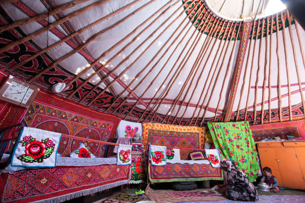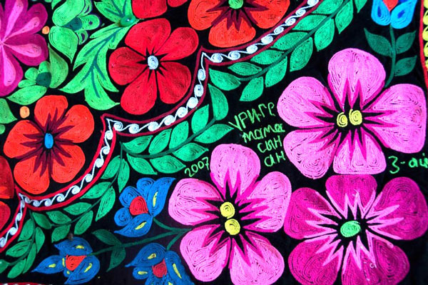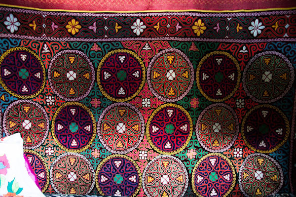 滞在中、ふと私の興味を引いたのは、カザフ人ガイドが見せてくれた1枚の大きな刺繍布だった。幅2メートルはある布の全体にびっしりと刺繍がほどこしてある。その布はカザフの天幕型住居の内部にかける壁掛けであるという。モンゴル人の天幕型住居の壁にはこんなに手の込んだ壁掛けはかかっていなかった。なぜ、カザフ人はわざわざ壁掛けを作るのだろう。この布は、カザフ人にとってどんなモノといえるだろう。