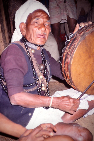 チェパンの山村では、そうした道筋をシャマンが描いてきた(写真4)。シャマンは、身近な山の頂の神々の力を得て、魂を飛翔させ、月や太陽に近い視点から景観を描き出す。さらにタルーの村々から見える地平線の彼方の景観を描き、やがて真っ暗な地下世界にかがり火を点しながら進む。地の底には、地表の命の根源とでも言える諸存在がいる。それらとの出会い、交渉する様が描かれ、最後に魂は自己の身体に戻る。そうした景観は、単なる想像で描かれているのではない。夢で「知覚」された全体像なのである。シャマンが語る景観の移り変わりを聞き入る人たちは、その道筋を確認していくのは「チュプト(楽しい)」と言う。シャマンは、日常で出会う様々なモノや生物、道具などにも独自の視点と通常の人間には知覚できない先や奥があること、それを踏まえて諸存在に配慮する必要があることを説く。