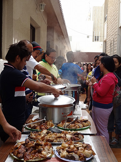 コミュニティの核となっているのは、職業、趣味、出身地、宗教(宗派)、出身大学等に基づく団体である。各団体は、結社の自由の制限に注意を払いながらも機会があるごとにメンバーが集まり、神へ感謝しながらフィリピン料理を食べ、情報交換や助け合いをする。助け合いはメンバー内にかぎらない。雇用主の家で虐待されシェルターに逃げてきたフィリピン人家事労働者に対し炊き出し(写真3)や帰国費用のカンパといった支援をしたり、フィリピンでの災害時には義援金を送ったりする。