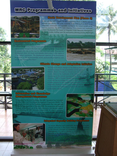 1990年代に入って冷戦が終結し、1995年4月に「メコン河流域の持続可能な開発のための協力協定」が調印され、これを受けてメコン河委員会(MRC: Mekong River Commission)が設置された。MRCの目的は流域管理であるが、2006年には「戦略計画2006-2010」が策定され、12項目(BDP、環境、情報および知識管理、統合的人材能力開発、水利用、洪水管理および緩和策、干ばつ管理、農業・灌漑・林業、航行、水力発電、漁業、観光)からなる統合的プログラムを構築された。これは、今日の「Basin Development Strategy 2021-2030」の戦略的優先分野(strategic priorities)にも引き継がれている。2010年8月には、西口清勝(立命館大学名誉教授)代表の科研プログラム「ASEAN・Divideの克服とメコン川地域開発(GMS)に関する国際共同研究」でメコン委員会(ラオス・ビエンチャン)を訪問したが、玄関に入るとMRCのプログラムの看板が置いてあったのが印象的であった。(写真1、写真2)(写真3)