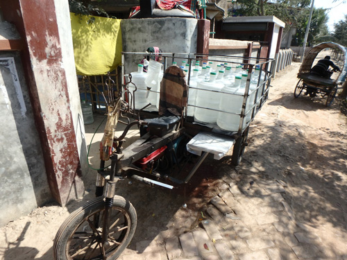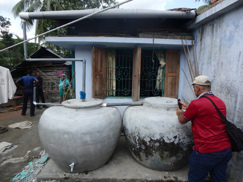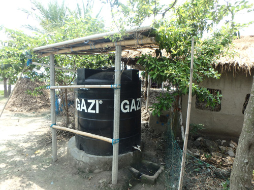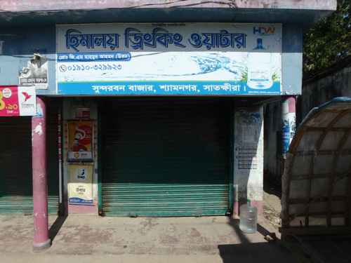 バングラデシュ南西部農村では、近年において商業的手法を導入した飲料水供給が盛んに実施されるようになっている。例えば、NGOや社会的企業が雨水を貯水するためのタンクを寄付ではなく販売によって提供している(写真1、写真2)。雨水は基本的に汚染物質を含まない水源であり、適切に採水および貯水がなされれば安全な飲料水を供給することができる17。WHOと国際連合児童基金による「水と衛生共同モニタリング・プログラム」においても、雨水は「改善された水源」としてその普及が推奨されている18。雨水貯水タンクに加えて、水中の水分子以外のすべてを除去できる逆浸透膜を用いて地下水を濾過し販売する事例も近年において増加している19。このような水の販売店はNGOや個人によって経営されており(写真3、写真4)、これらの店では購入世帯への水の宅配サービスが実施され、多くの村人が利用するようになっている(写真5)20。