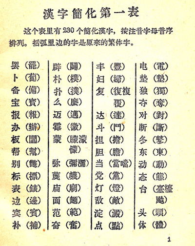 要するに漢字をやめてしまって音標文字つまりアルファベットにする。その前段階で複雑な漢字を簡体字にする、ということになる。1956年に『漢字簡化方案』2が作られ、漢字簡化第一表230字、漢字簡化第二表285字、あわせて515字が実施された。そこでは文字を簡単にするだけでなく、「复(復複覆)」のように発音や形の似たものがまとめられている。そのあと「第二次漢字簡化方案(草案)3」で2000字程度の簡体字が考案されたが、それは廃案となっている。