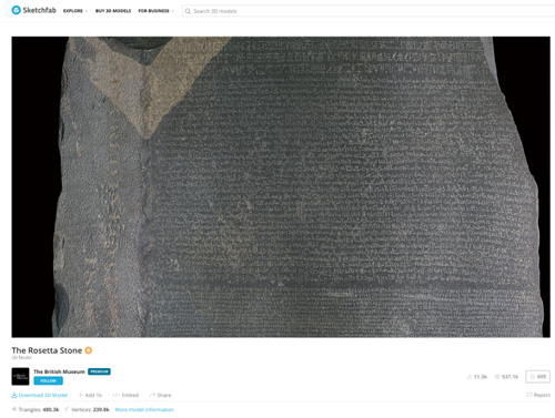 同一の内容がヒエログリフ、デモティック、古代ギリシャ語で刻まれており、解読の決定的な手掛かりとなった。この写真は、大英博物館が3Dモデル共有・閲覧プラットフォームであるSketchfabにて公開しているロゼッタ・ストーンの高精細3Dモデル。